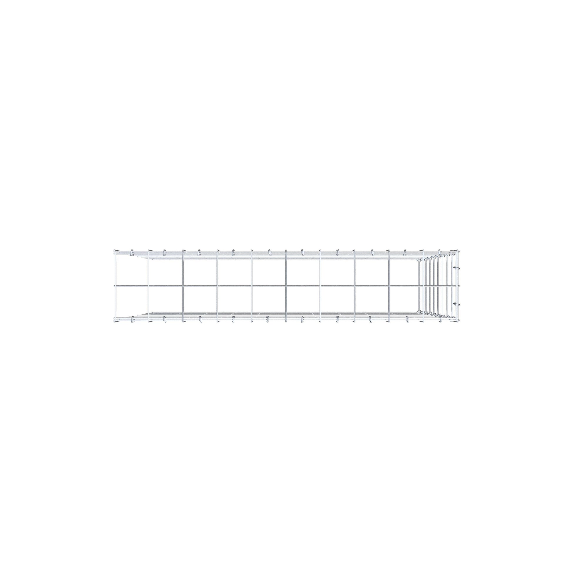 • Hinweis: kein eigenes Bodengitter und kein eigenes Stirngitter – die Verbindung erfolgt über das Deckelgitter und den Verschluss der unteren Gabione sowie den Verschluss der seitlichen Gabione.